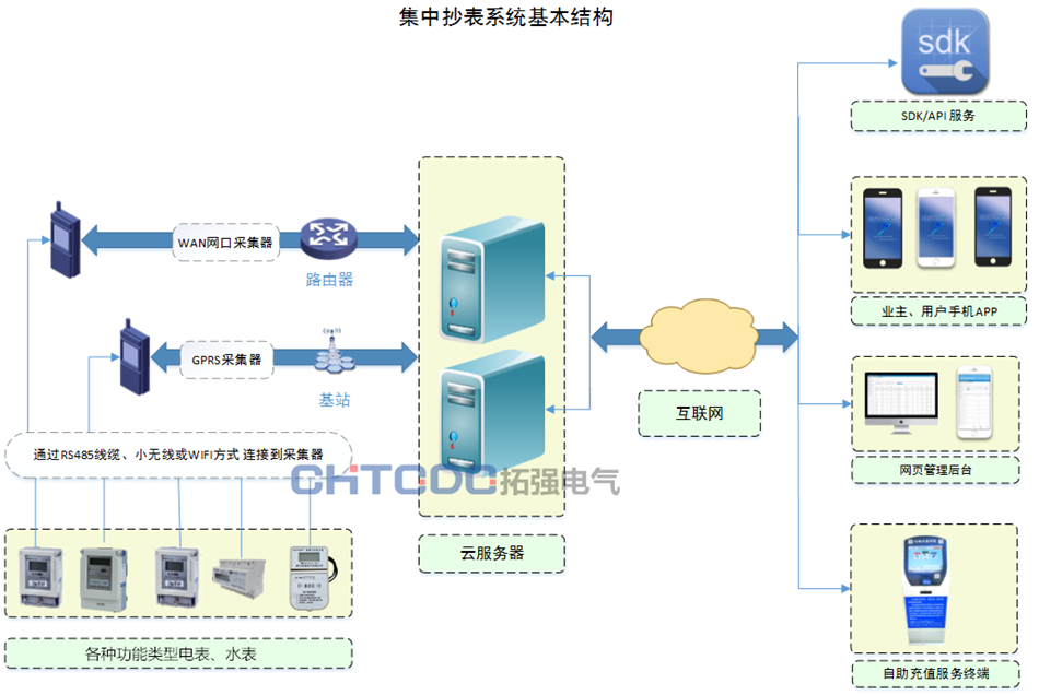 本係統由水電表(biǎo),雲服務器,數據(jù)采集器,手(shǒu)機APP,網頁後台,自助充(chōng)值終端等組成