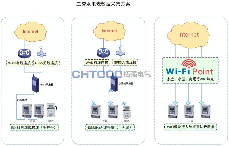 電能表本身不具備物聯網通訊能力,行業內通過在一定範圍(wéi)內布置采集器,將多隻電能(néng)表(biǎo)數據采集到一台采集器(qì)後發送(sòng)給雲端(duān)服務器。