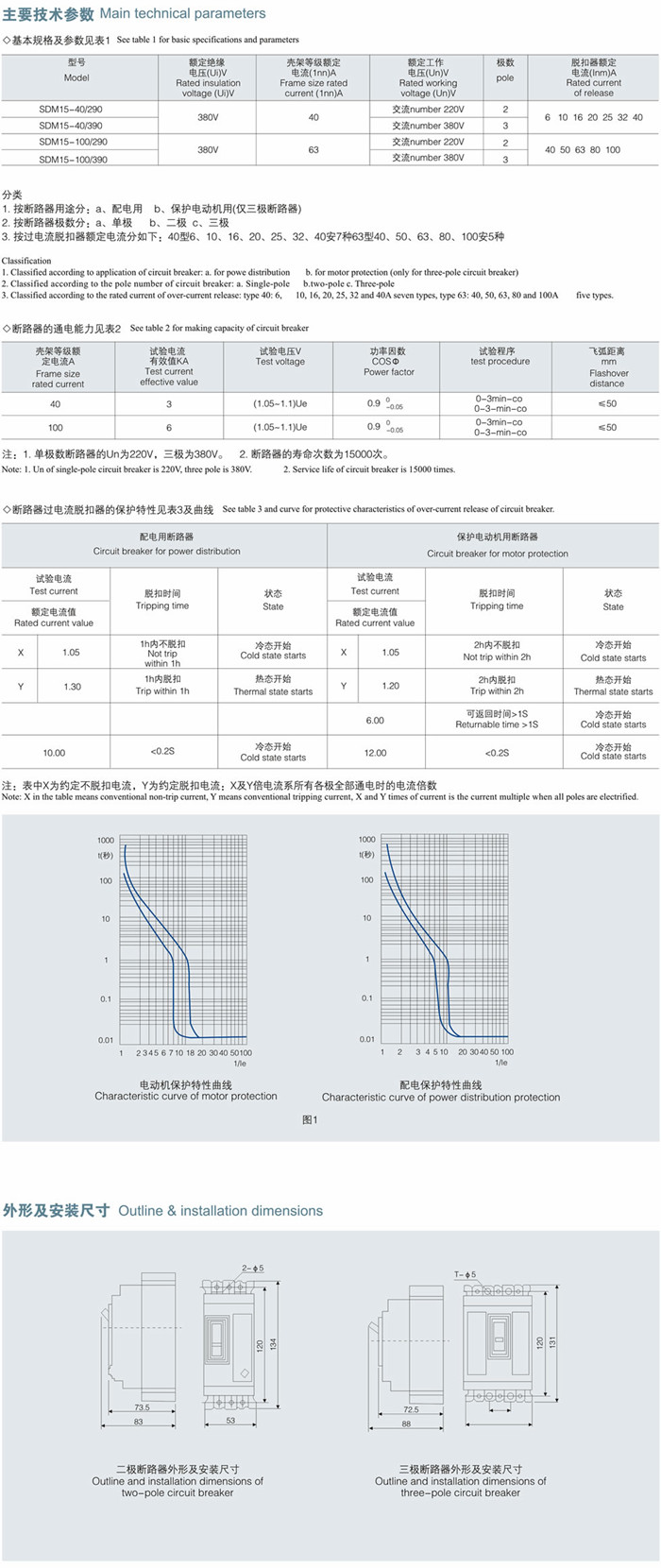 SDM15-100塑(sù)料外殼式(shì)斷路器(以下簡稱斷路器)適用於交流50Hz額定(dìng)電壓至380V的電路中,作通斷操作,並起過載短路保護作用(yòng),亦可作為線路的不頻(pín)繁轉換及電動機的不頻繁起動(dòng)之用。