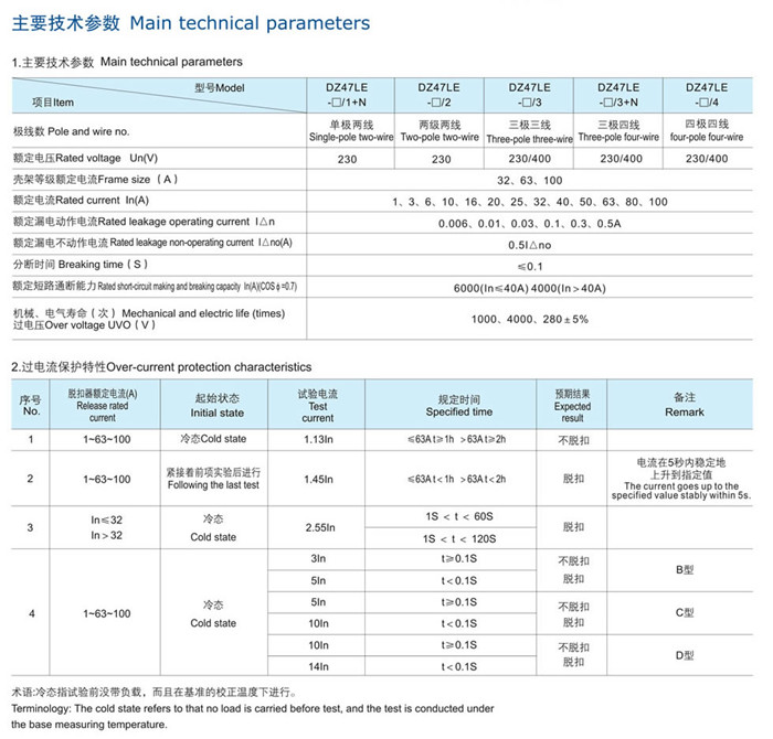 DZ47LE-63係列(liè)漏電斷路器(qì),適用於交流50Hz或(huò)60Hz,額定(dìng)電壓單(dān)相230V,三相(xiàng)400V及以下,額定電流1-100A電(diàn)路中,當人身觸(chù)電或電網泄漏電流超過規定值時,漏電斷路器能在極短的時間內迅(xùn)速切(qiē)斷故(gù)障電源,保護人(rén)身及用電(diàn)設備的安全(quán),同時具有過壓、欠壓、過載、短路等保護功能,亦可作為線(xiàn)路的不(bú)頻繁轉換及電動機的不頻(pín)繁起動之用。本產品體積小,重量輕,外形(xíng)美觀,導軌安裝,使(shǐ)用方便。