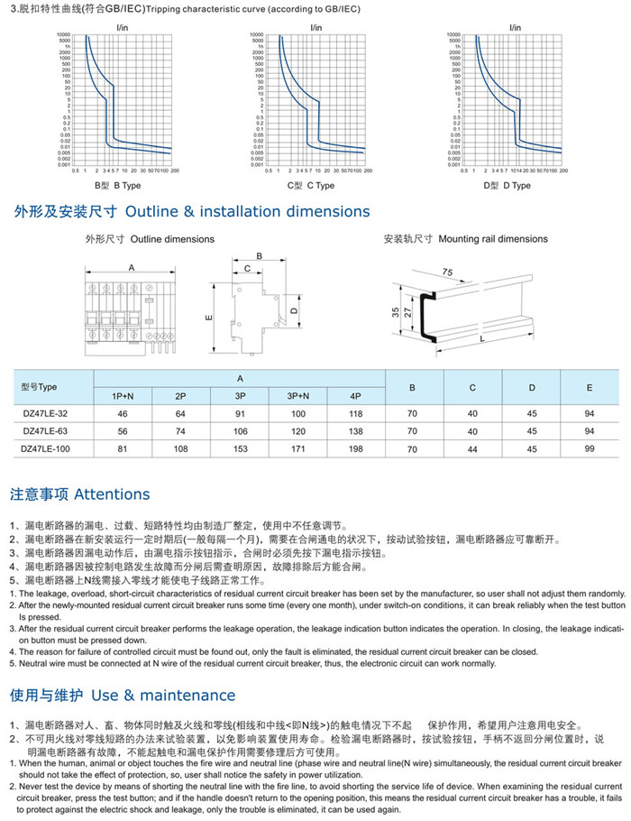 DZ47LE-100係列漏電斷路器,適(shì)用於交流50Hz或60Hz,額定電壓單相230V,三相400V及以下,額定電(diàn)流1-100A電路(lù)中,當人身(shēn)觸電或電網泄漏電流超過規定值時,漏電斷路器能在極短的時間內迅速切斷故障電源,保護人身及用(yòng)電設備的安全,同時具有過壓、欠壓、過載、短路等保護功能,亦可作為線路的不頻繁轉(zhuǎn)換及電動機的不頻繁起動之用。本產品體積小,重量輕,外形美觀,導軌安裝(zhuāng),使用(yòng)方便。