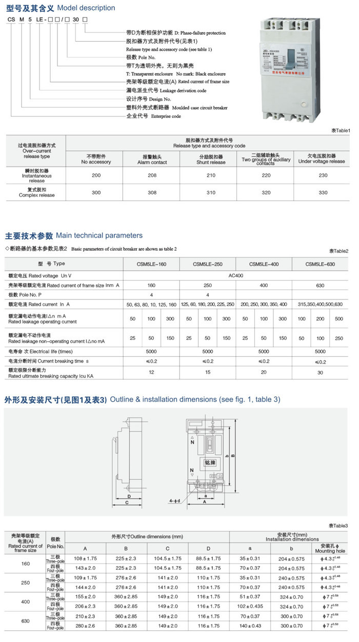 CSM5LE(DZ20LE)係列漏電斷路器適用於交流50Hz、額定電(diàn)壓400V,額定電流至(zhì)630A及以下的電路中, 可作為人身觸電、漏電保護用,也可用來防止設(shè)備絕緣損壞,產(chǎn)生接地故障電流而引起(qǐ)的火災(zāi)危險。具(jù)有隔離、斷相保護功能,適(shì)用於建 築行業分配電。.並可用來對線路(lù)的過載、短路和欠電壓保護,亦可用來對線路的不頻繁轉換之用。